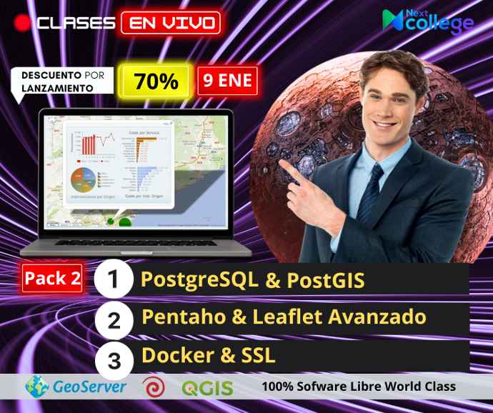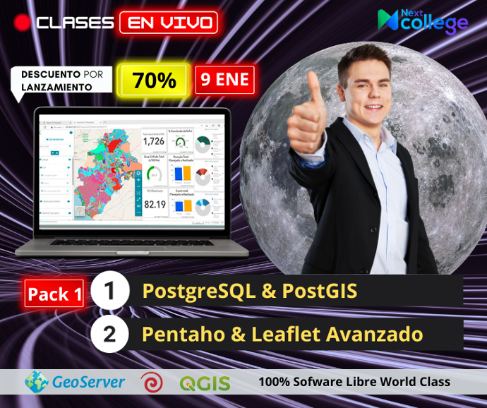 Este paquete va dirigido a quienes ya llevaron el curso de creación de Geo Portales con Pentaho, Leaflet y Geo Server o que ya tienen dichos conocimientos adquiridos, por lo que te lleva al siguiente nivel cubriendo la creación de Geo Databases con PostgreSQL y PostGIS, sumándole la creación de Geo Portales con proyección de mapas 3D y paneles con Charts en 3D para tus Geo Dashboards, siendo capaz de personalizar Sidebars y Side Panels con generación de contenido dinámico, empleando tecnologías 100% de Software Libre - Sin costo de Licencia.